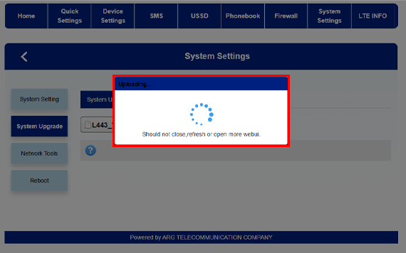 گام نهم: با کلیک بروی دکمه "System Upgrade"، مودم شروع به بروزرسانی مودم با فایل بارگذاری شده می کند و حدود ۵ دقیقه زمان بروزرسانی میتواند به طول انجامد.