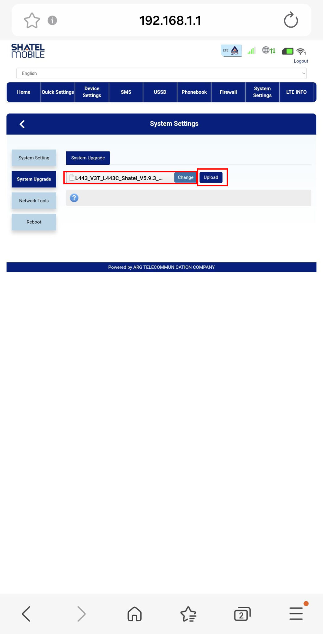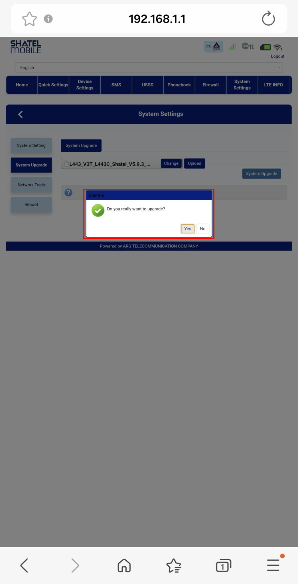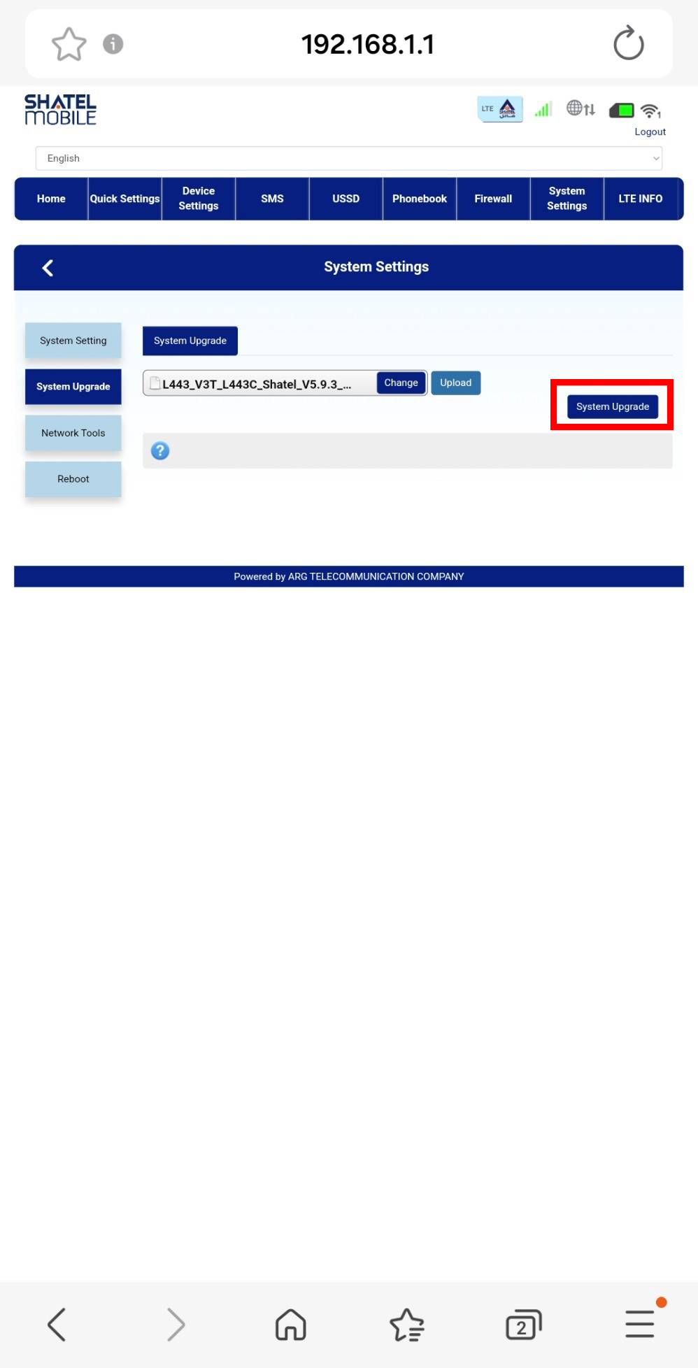 گام نهم: با کلیک بروی دکمه "System Upgrade"، مودم شروع به بروزرسانی مودم با فایل بارگذاری شده می کند و حدود ۵ دقیقه زمان بروزرسانی می تواند به طول انجامد.