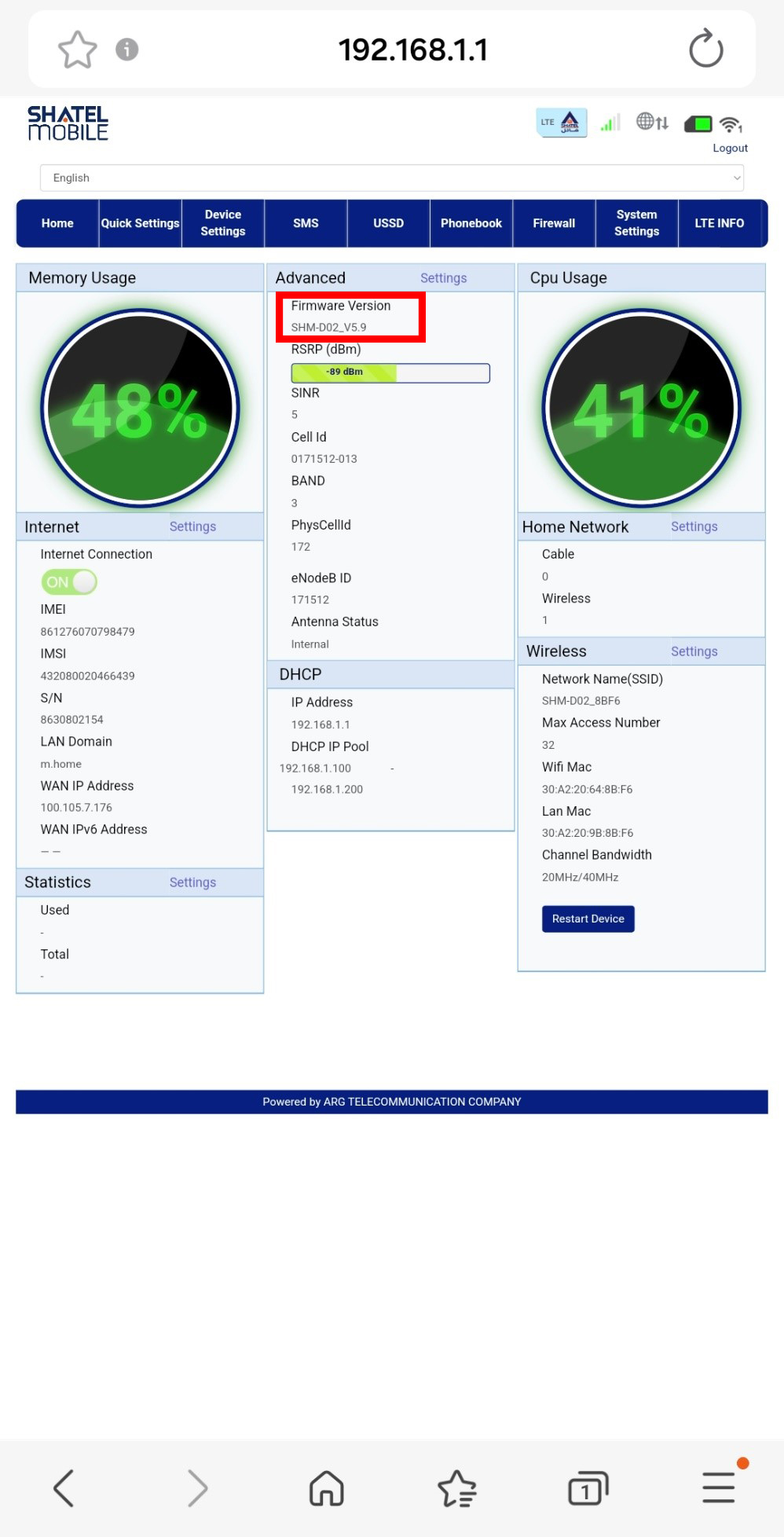 گام یازدهم: پس از ورود به صفحه کنسول مودم می بایست در صفحه Home در قسمت Firmware Version عبارت SHM-D02_V5.9 نمایش داده شود .